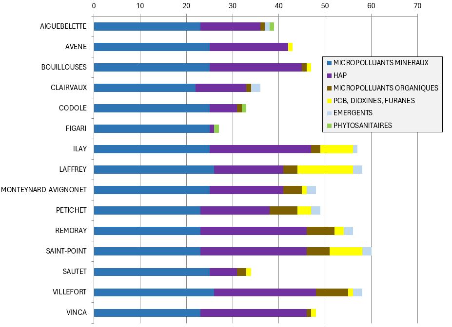 Contrairement aux HAP que l'on retrouve sur la totalité des plans d'eau, les composés du groupe des "PCB, Dioxines, Furanes" se concentrent sur un nombre plus limité de plans d'eau (11/15) et de manière véritablement notable sur seulement trois plans d'eau : le lac de Laffrey, et les lacs d'Ilay et de Saint-Point.